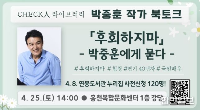 한민일보 서울포커스 진광성 기자 | 홍천 군립 도서관이 오는 4월 25일 오후 2시 홍천 복합 문화센터 1층 강당에서 배우 겸 작가 박중훈을 초청해 2026년 ‘체크인 라이브러리’의 첫 번째 북토크를 개최한다.