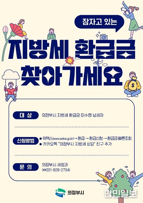 한민일보 서울포커스 심기옥 기자 | 의정부시는 납세자가 아직 찾아가지 않은 지방세 환급금을 돌려주기 위해 5월 말까지 ‘지방세 환급금 일제정리 기간’을 운영한다.