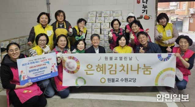 한민일보 서울포커스 진광성 기자 | 수원시 팔달구 매교동은 지난 22일, 원불교 수원교당(교구장 김도천)으로부터 직접 담근 배추김치(5kg) 100박스를 기부받았다고 밝혔다.