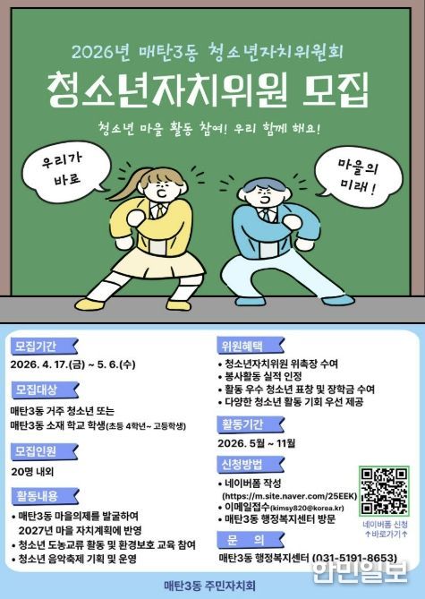 한민일보 서울포커스 진광성 기자 | 수원시 영통구 매탄3동은 매탄3동 주민자치회가 지역 청소년의 참여를 확대하고, 향후 지역사회를 이끌어 나갈 역량을 기르기 위해 2026년 청소년자치위원회 위원을 모집한다고 밝혔다.