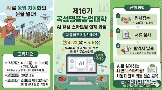 한민일보 서울포커스 박용남 기자 | 전남 곡성군이 미래 농업을 선도할 스마트농업 전문가 육성을 위해 ‘제16기 곡성명품농업대학 AI 활용 스마트팜 설계 과정’을 운영한다고 24일 밝혔다.