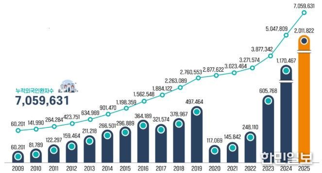 외국인 환자 유치는 2009년부터 2019년까지 꾸준히 증가(연평균 23.5%)했으나 코로나19 영향으로 2020년 12만 명으로 급감했다. 이후 점차 회복되어 팬데믹 이후 2023년 61만 명, 2024년 117만 명, 2025년 201만 명으로 3년간 매년 두 배 수준의 증가세를 보이며 3년 연속 역대 최대 실적을 경신하고 있으며, 2009년 통계 집계 이후 누적 외국인 환자 수도 706만 명(실환자)에 이르고 있다.