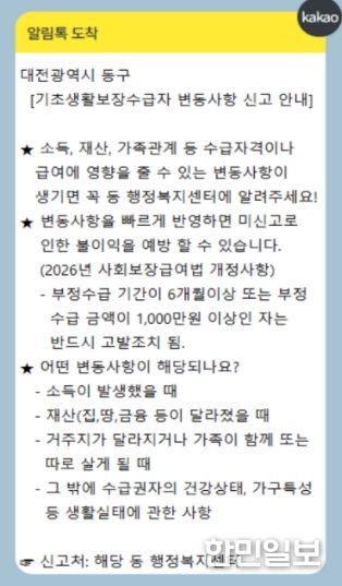 한민일보 서울포커스 임경복 기자 | 대전 동구는 국민기초생활보장 생계급여 수급자를 대상으로 ‘변동사항 신고 알림톡’ 서비스를 본격 운영한다고 24일 밝혔다.
