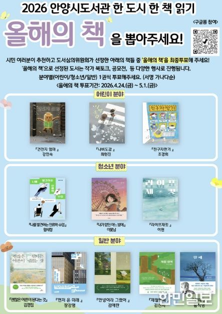 한민일보 서울포커스 김성윤 기자 | 안양시는 2026년 한 도시 한 책 읽기 ‘올해의 책’ 선정을 위한 시민 선호도 조사를 오는 5월 1일까지 온·오프라인으로 진행한다고 24일 밝혔다.