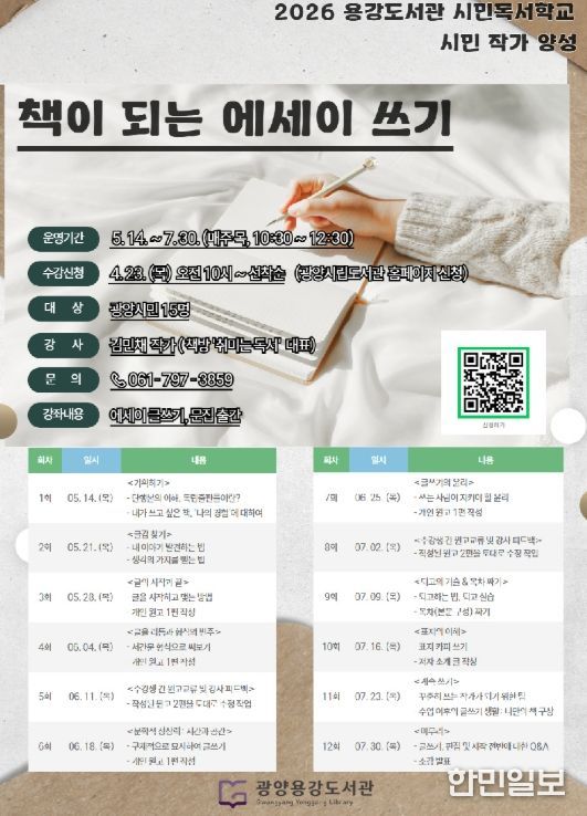 한민일보 서울포커스 임광현 기자 | 광양용강도서관은 ‘문학책의 해’를 맞아 시민의 글쓰기 역량을 높이기 위해 ‘책이 되는 에세이 쓰기’ 프로그램 수강생을 모집한다고 밝혔다.