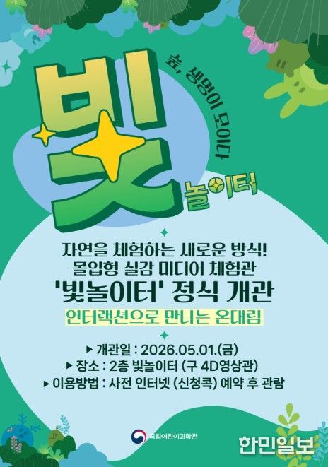 한민일보 서울포커스 기자 | 과학기술정보통신부 국립어린이과학관은 몰입형 실감 매체(실감 미디어) 체험관인 『빛 놀이터』를 새롭게 조성하고, 4월 한 달간 시범운영을 거쳐 5월 1일 정식 개관한다.