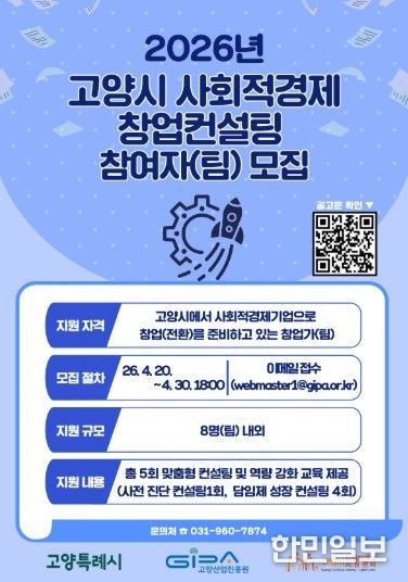한민일보 서울포커스 김은금 기자 | 고양산업진흥원이 운영하는 고양시사회적경제지원센터가‘2026년 고양시 사회적경제 창업컨설팅 사업’에 참여할 예비 창업자(팀)을 오는 30일까지 모집한다.
