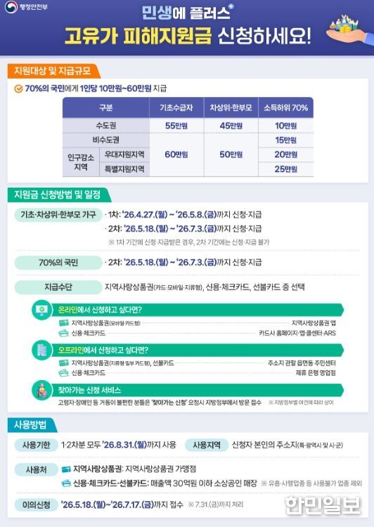 취약계층을 대상으로 하는 1차 신청은 4월 27일부터 5월 8일까지이며, 소득 하위 70% 일반 가구를 대상으로 하는 2차 신청은 5월 18일부터 7월 3일까지 진행된다.