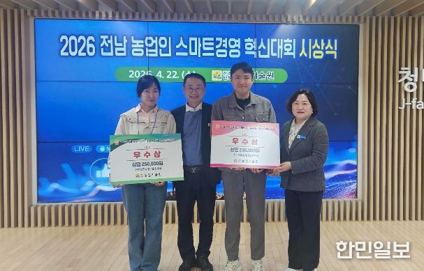 한민일보 서울포커스 박용남 기자 | 영광군은 지난 4월 22일 전라남도농업기술원 창농타운에서 열린 ‘2026년 전남 농업인 스마트경영 혁신대회’에서 관내 청년농업인 2명이 우수상을 수상했다고 밝혔다.