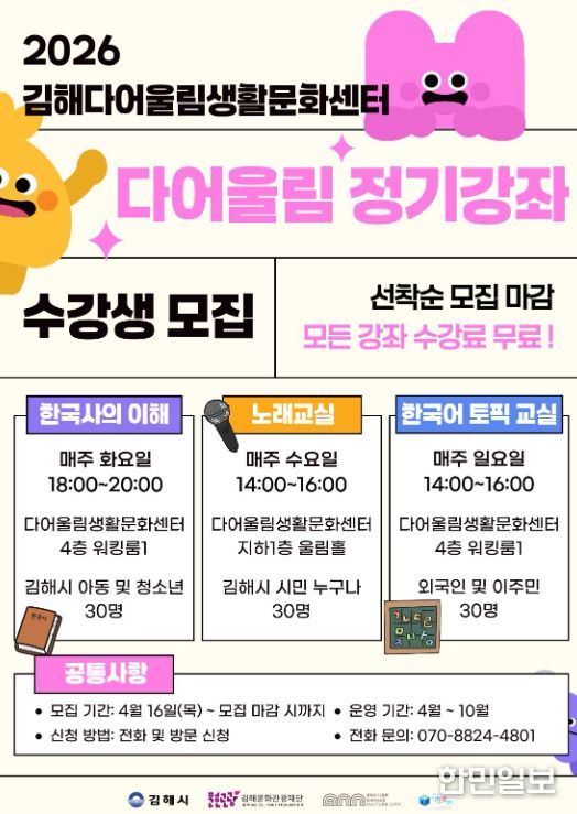 한민일보 서울포커스 김은금 기자 | (재)김해문화관광재단 문화도시팀 김해다어울림생활문화센터는 지역 주민의 역량 강화와 문화 향유 기회 확대를 위해 ‘2026 다어울림 정기강좌’를 개설하고 본격적인 운영에 들어간다고 밝혔다.