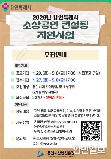 한민일보 서울포커스 김성윤 기자 | 용인특례시와 용인시산업진흥원은 ‘2026년 용인시 소상공인 창업 및 경영 컨설팅 지원사업’에 참여할 소상공인을 모집한다고 26일 밝혔다.