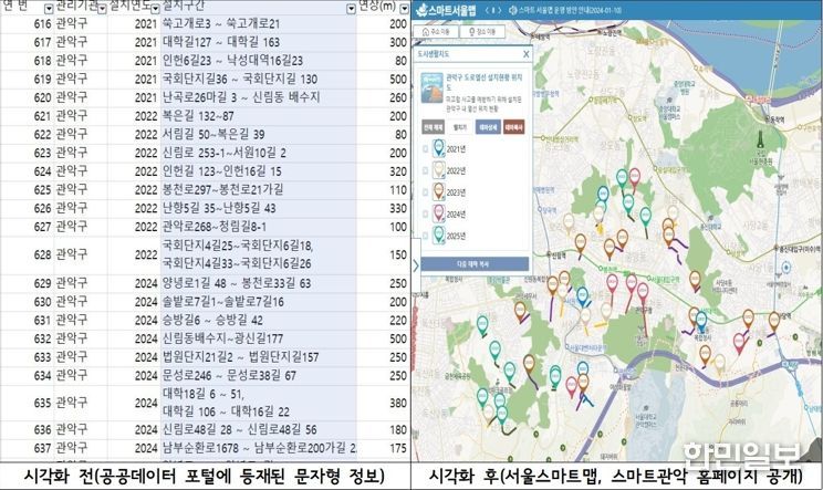 이에 관악구는 개방된 공공데이터와 현장 관리를 위해 내부적으로 작성한 도면 자료를 결합했다. 텍스트와 도면 데이터를 ‘서울스마트맵’상의 공간정보로 정밀하게 전환·구현함으로써, 이제는 누구나 도로열선의 구체적인 위치를 지도상에서 한눈에 확인할 수 있게 됐다.