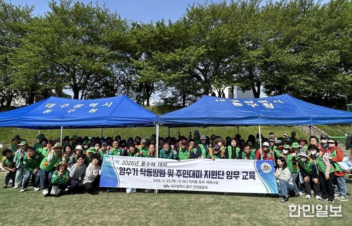 한민일보 서울포커스 임경복 기자 | 대구 동구청은 지난 23일, 지저동 둔치 체육시설에서 동구 지역자율방재단 단원 및 관내 22개 동 행정복지센터 재난안전담당자 120여명이 참여한 가운데 양수기 작동법 및 주민대피지원단 임무 교육을 실시했다.