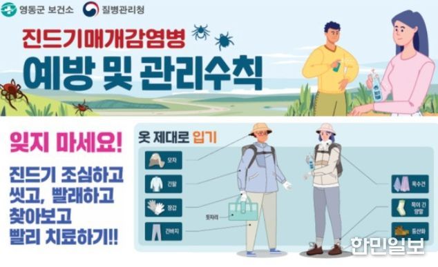예방수칙으로는 △긴팔·긴바지·토시 등 피부 노출을 최소화하는 복장 착용 △기피제 사용하기 △풀숲 피하기 △외출 후 즉시 샤워하기 △야외활동 후 의복 털어 세탁하기 등이 있다.