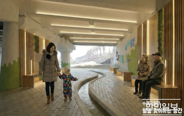 공간별 계획을 보면, 수정교 하부에는 주민 휴게공간과 작품 감상이 가능한 열린 갤러리가 마련되며, 벽놀이 교구 등을 활용한 어린이 놀이공간도 함께 조성된다.