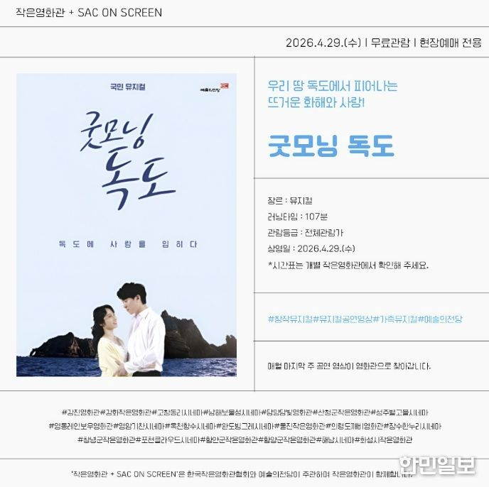 작은영화관 주식회사 관계자는 “매월 마지막 주 수요일, 공연 영상을 영화관에서 감상할 수 있는 기회를 마련하게 되어 뜻깊다”며 “4월에는 29일 오후 1시 10분에 뮤지컬 ‘굿모닝 독도’가 무료 상영될 예정이니 많은 관심과 참여를 바란다”고 말했다.