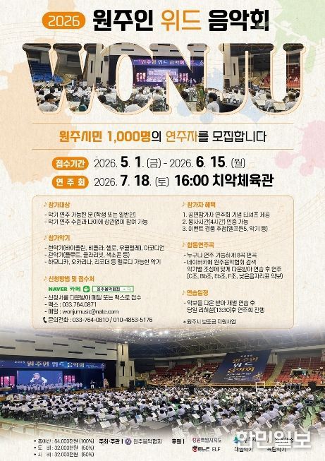 한민일보 서울포커스 임경복 기자 | (사)한국음악협회 원주지부는 오는 7월 18일 열리는 ‘2026 원주인 위드 음악회’에 참여할 시민 연주자 1,000명을 모집한다.