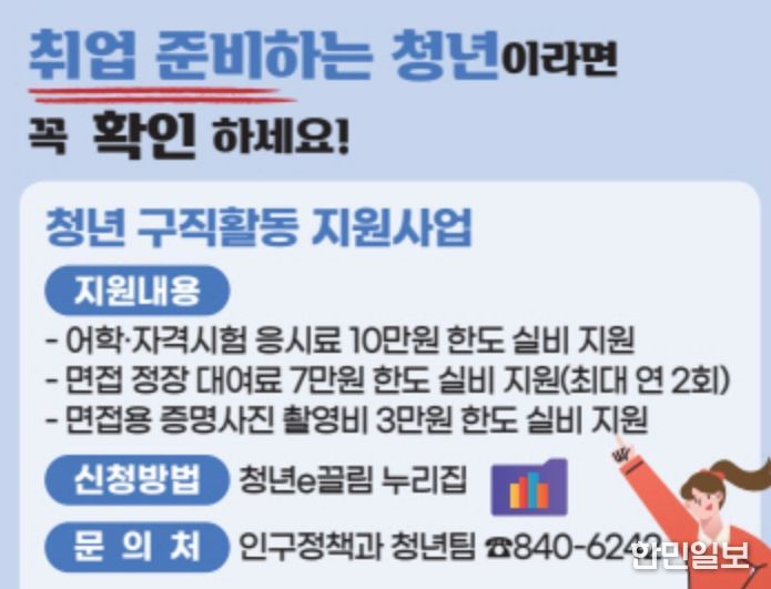 안동시 관계자는 “청년 구직활동에 꼭 필요한 지원을 하나로 묶어 체감도를 높이고자 사업을 통합했다”며 “앞으로도 청년들이 실질적으로 필요로 하는 정책을 지속적으로 발굴․추진하겠다”고 밝혔다.