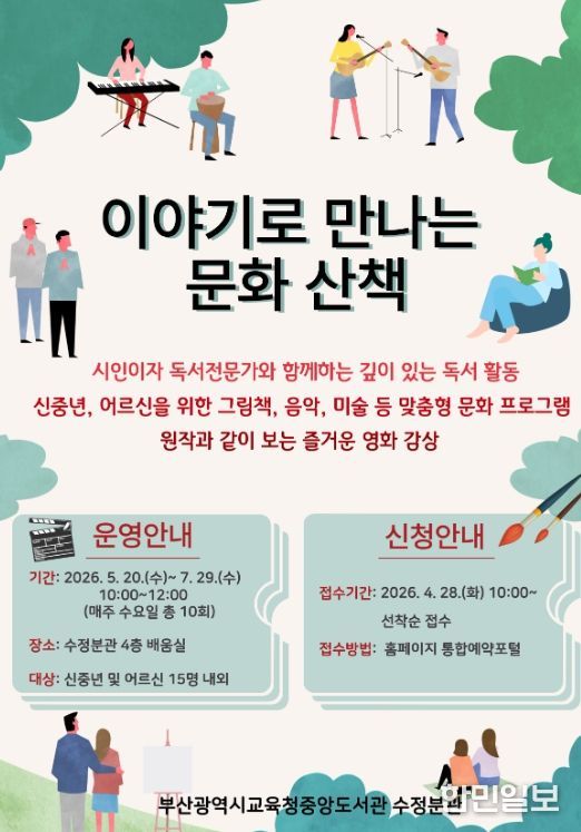 한민일보 서울포커스 임광현 기자 | 부산광역시립중앙도서관은 오는 5월 20일부터 7월 29일까지 매주 수요일마다 중앙도서관 수정분관에서 신중년 및 어르신 15명을 대상으로 ‘이야기로 만나는 문화 산책’ 프로그램을 운영한다.