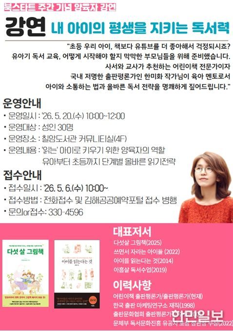 한민일보 서울포커스 김은금 기자 | 김해시 칠암도서관은 북스타트 주간을 맞아 올바른 독서 양육의 방향을 제시하기 위해 내달 20일 ‘내 아이의 평생을 지키는 독서력’ 강연을 개최한다고 27일 밝혔다.