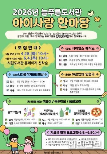 한민일보 서울포커스 김용택 기자 | 군산시 늘푸른도서관은 가정의 달을 맞아 어린이와 가족이 책과 함께 소중한 추억을 쌓을 수 있는 어린이 특화 문화행사 ‘아이사랑한마당’을 운영한다고 밝혔다.