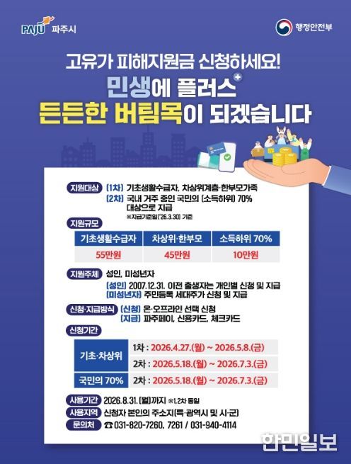 한민일보 서울포커스 진광성 기자 | 파주시는 오늘(27일)부터 시민 생활 안정을 위한 정부 추진 ‘고유가 피해지원금’1차 신청을 받는다. 이번 1차 신청 대상은 기초생활수급자, 차상위계층, 한부모가구이며, 신청 기간은 4월 27일부터 5월 8일까지다.