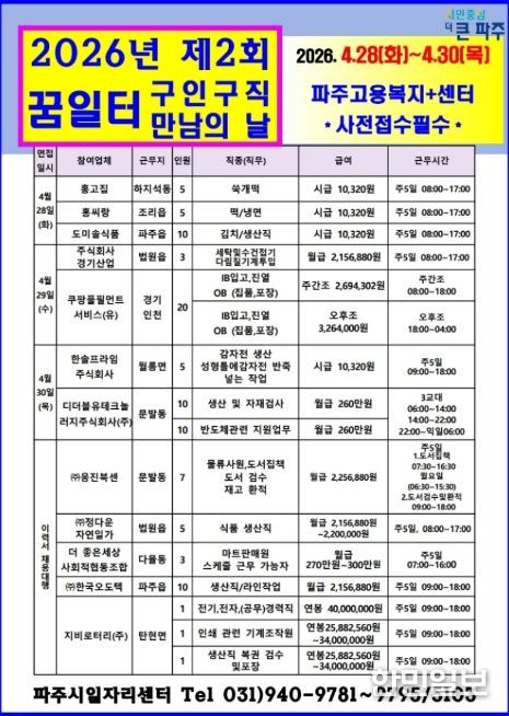 한민일보 서울포커스 진광성 기자 | 파주시는 오는 28일부터 30일까지 파주고용복지플러스센터(금촌동 엠에이치(MH)타워 8층)에서 2026년 제2회 ‘구인·구직 만남의 날’을 개최한다.