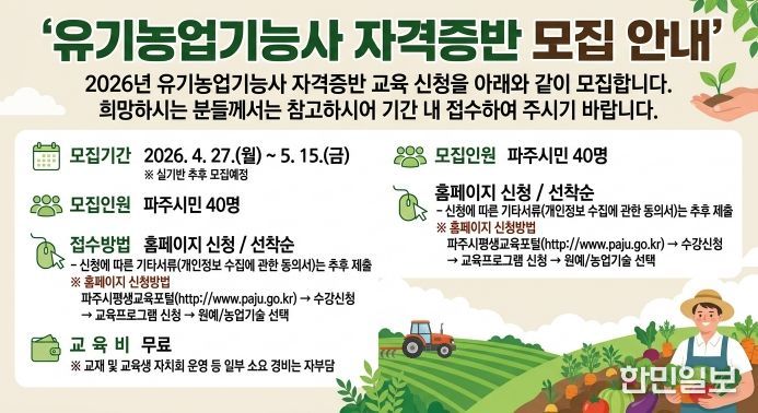 한민일보 서울포커스 진광성 기자 | 파주시농업기술센터는 친환경농업 분야 농업 전문 인력 육성을 위한 '2026년 유기농업기능사 자격증 취득’교육생을 4월 27일부터 5월 15일까지 모집한다.