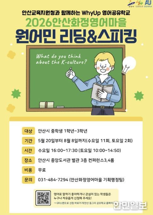 한민일보 서울포커스 임철현 기자 | 안산시가 설립하고 안산대학교가 운영하는 안산화정영어마을은 경기도안산교육지원청과 협력해 관내 중학생을 대상으로 ‘제2회 원어민 리딩·스피킹 프로그램’을 운영하고 참가자를 모집한다고 27일 밝혔다.