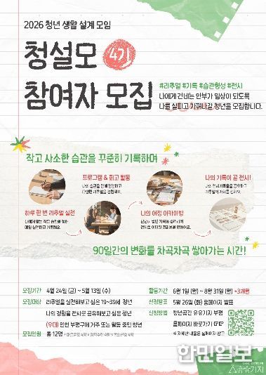 한민일보 서울포커스 김성혜 기자 | 부평구 청년공간 유유기지 부평은 오는 5월 13일까지 청년생활 설계 모임 ‘청설모’ 4기 참여자를 모집한다.