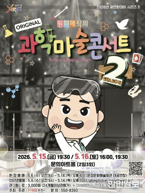 한민일보 서울포커스 김봉순 기자 | 문경문화예술회관에서는 5월 어린이 달을 맞아 마술과 과학의 경계를 넘나들며 온가족 모두가 재미있게 관람할 수 있는 과학마술콘서트 시즌2 공연을 5월 15일 19:30, 16 16:00, 19:30 (2일 3회)에 문희아트홀에서 개최한다.