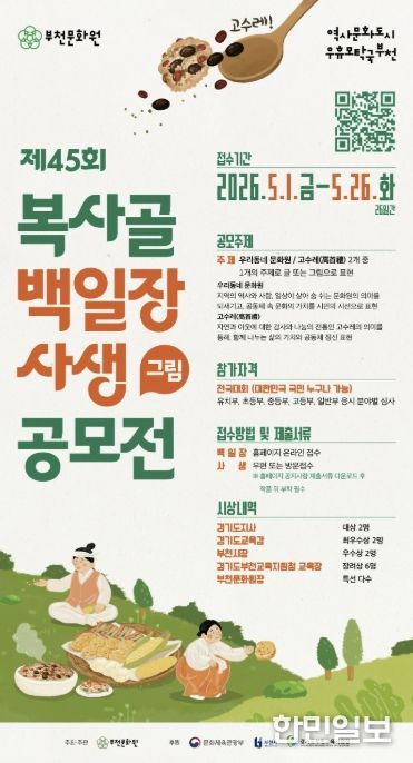 한민일보 서울포커스 김윤이 기자 | 부천문화원이 설립 60주년을 기념하여 지역 문화의 가치를 시민과 공유하고 향토문화의 지속가능한 기반을 마련하기 위한 ‘제45회 복사골 백일장·사생(그림) 공모전’을 개최한다. 이번 공모전은 지난 60년간 지역 문화의 구심점 역할을 해온 부천문화원의 역사를 되짚어보고, 국민의 참여를 통해 지역 공동체의 유대감을 강화하고자 기획됐다.