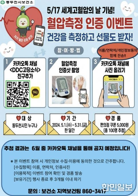 한민일보 서울포커스 임경복 기자 | 동두천시보건소는 오는 5월 17일 세계고혈압의 날을 기념해 시민들의 심뇌혈관질환 예방과 건강관리 실천을 유도하고자 ‘혈압측정 인증 이벤트’를 운영한다고 밝혔다.