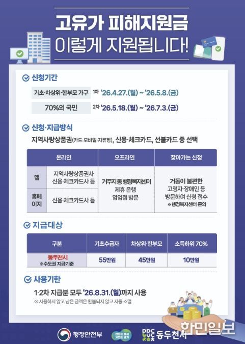 한민일보 서울포커스 임경복 기자 | 동두천시가 중동발 고유가와 고물가로 인한 시민 부담을 완화하고 지역경제 회복을 지원하기 위해 ‘고유가 피해지원금’을 지급한다.