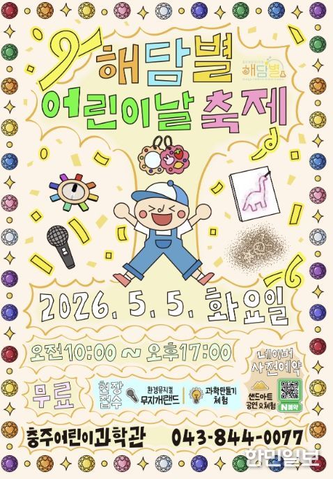 한민일보 서울포커스 김다남 기자 | 충주어린이과학관은 오는 5월 5일 어린이날을 맞아 연나이 8세 이하 어린이와 동반 가족을 대상으로 ‘해담별 어린이날 축제’를 무료로 개최한다고 밝혔다.
