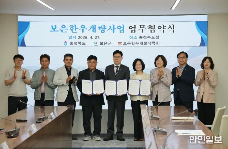 한민일보 서울포커스 김봉순 기자 | 충북 보은군은 27일 충북도청 여는마당에서 충청북도, 보은한우개량작목회와 함께 한우 개량 고도화와 우량 유전자원 확산을 위한 업무협약을 체결하고 보은한우 경쟁력 강화를 위한 추진 기반을 마련했다.