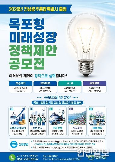 한민일보 서울포커스 임광현 기자 | 목포시가 전남·광주 통합특별시 출범에 대비하고 지역의 미래 성장동력을 발굴하기 위해 ‘목포형 미래성장 정책제안 공모전’을 개최한다.