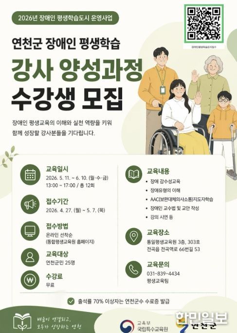 한민일보 서울포커스 임경복 기자 | 연천군은 교육부 국립특수교육원이 주관하는 '2026년 장애인 평생학습도시 운영 지원사업' 공모에 선정됨에 따라 장애인 평생교육 현장형 강사 양성 과정을 운영한다.
