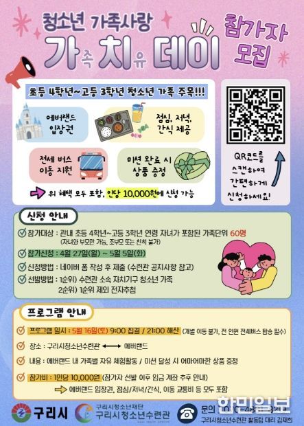 모집 대상은 구리시 관내 초등학교 4학년부터 고등학교 3학년까지의 자녀를 포함한 가족 총 60명이다. 참가자 전원에게는 에버랜드 자유이용권을 비롯해 식사와 간식, 전세버스 이동 지원 등이 제공된다.
