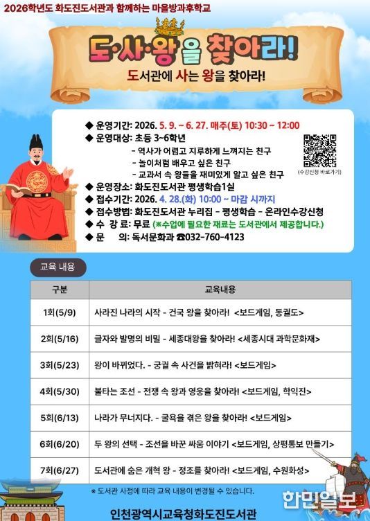 한민일보 서울포커스 유창렬 기자 | 인천광역시교육청화도진도서관은 5월 9일부터 6월 27일까지 매주 토요일, 초등 3~6학년을 대상으로 역사 프로그램‘도서관에서 사는 왕을 찾아라!’를 운영한다.