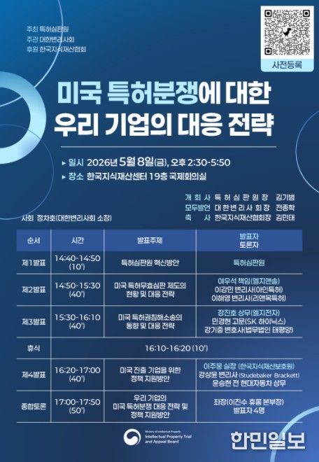 한민일보 서울포커스 임철현 기자 | 지식재산처 특허심판원은 5월 8일 14시 30분 한국지식재산센터(서울 강남구)에서 우리 기업의 미국 특허분쟁 대응 역량 강화를 위해 '미국 특허분쟁에 대한 우리 기업의 대응전략' 발표회를 개최한다고 밝혔다.