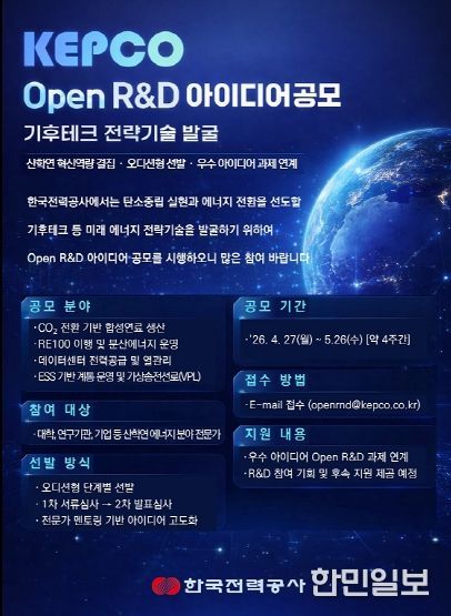 한민일보 서울포커스 임철현 기자 | 한국전력이 기후테크 등 미래 에너지 전략기술 확보를 위해 산·학·연 혁신 아이디어를 발굴하는 'Open R&D 아이디어 공모'를 추진한다.