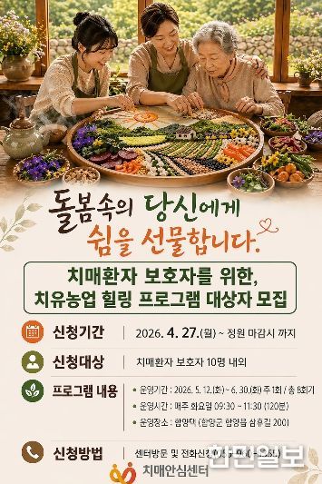 모집 대상은 치매 환자를 돌보고 있는 보호자로, 신청은 4월 27일부터 정원 마감 시까지 선착순으로 접수한다. 참여를 희망하는 경우 함양군 치매안심센터 방문 또는 전화로 신청할 수 있다.