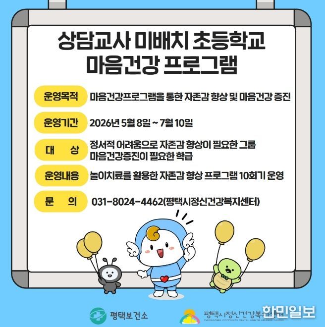 한민일보 서울포커스 황준형 기자 | 평택시는 상담교사가 배치되지 않은 초등학교 학생들의 정신건강 지원을 위해 ‘마음건강 프로그램’을 운영한다고 밝혔다.