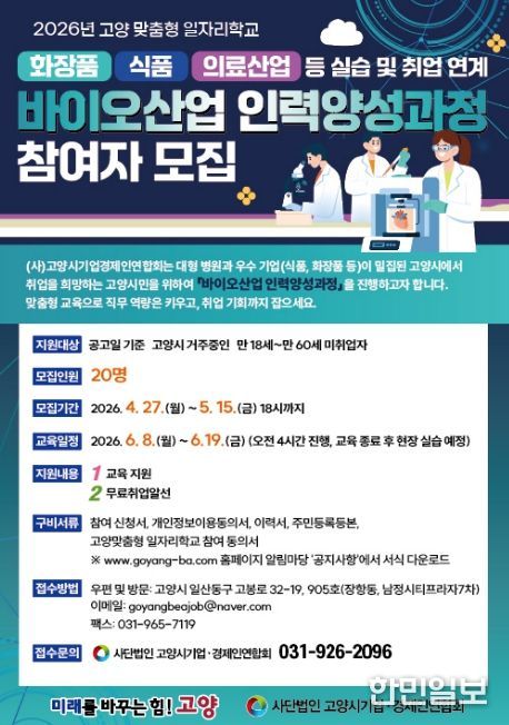 한민일보 서울포커스 김은금 기자 | 고양특례시는 2026년 고양맞춤형 일자리학교 공모사업 중 ‘바이오산업 인력 양성과정’의 참여자를 모집한다.