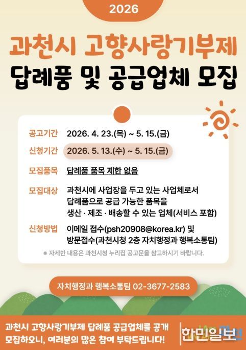 신청 대상은 답례품으로 제공할 수 있는 물품을 생산·제조하고 배송이 가능한 업체다. 참여를 희망하는 업체는 과천시 누리집 ‘과천소식'고시‧공고’에서 신청 서식을 작성한 뒤, 5월 13일부터 15일까지 전자우편 또는 과천시청 방문을 통해 서류를 제출하면 된다.