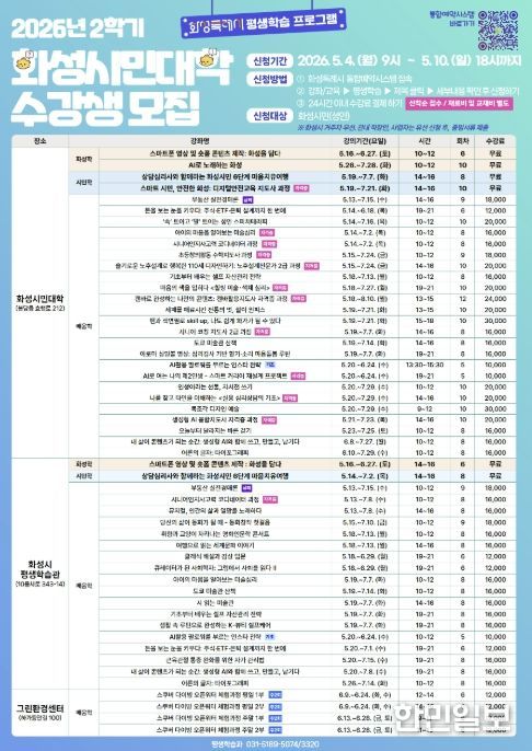 한민일보 서울포커스 진광성 기자 | 화성특례시는 2026년 화성시민대학 2학기 수강생을 오는 5월 4일부터 5월 10일까지 선착순으로 모집한다고 밝혔다.