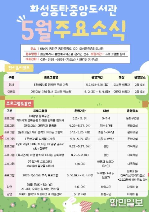 한민일보 서울포커스 진광성 기자 | 화성동탄중앙도서관이 어린이날과 가정의 달을 맞아 5월 한 달간 도서관 이용자와 시민을 대상으로 자료실과 3층 공공의 마당 등에서 다양한 문화행사를 운영한다.