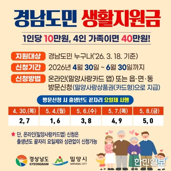 한민일보 서울포커스 김은금 기자 | 경남 밀양시는 오는 4월 30일부터 시민 생활 안정을 지원하기 위한 ‘경남도민 생활지원금’ 신청을 받는다고 밝혔다.