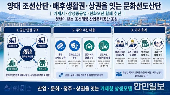한민일보 서울포커스 김은금 기자 | 거제시가 삼성중공업, 한화오션과 체결한 지역상생발전 협약을 바탕으로 양대 조선산업단지와 인근 배후생활권, 지역상권을 함께 잇는 문화선도산단 조성사업 공모 준비에 본격 나선다.